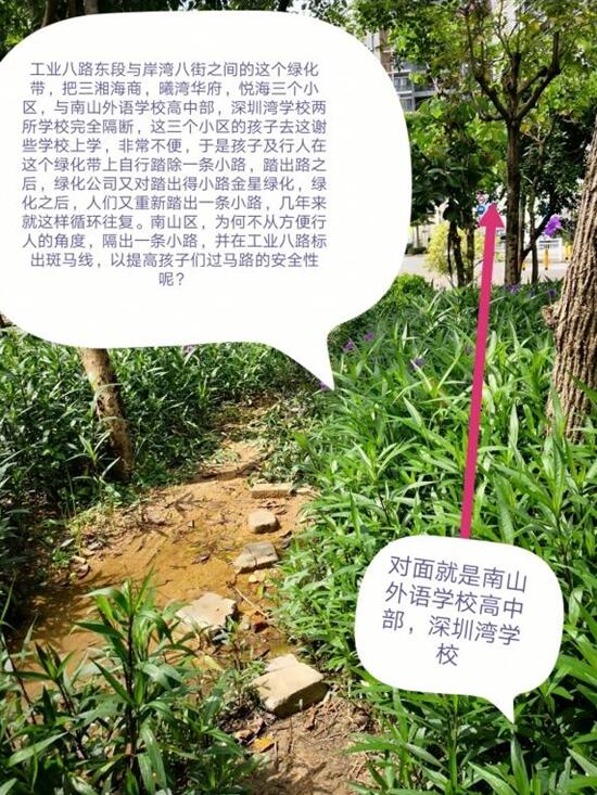 同時(shí),該市民還反映在工業(yè)八路東段與岸灣八街之間存在三個小區(qū)和兩個學(xué)校,周邊居民和孩子為了圖方便,在綠化帶上自行踏出了一條小路,綠化公司有對小路進(jìn)行綠化處理,但是處理過后,居民和孩子又會重新踏出一條,幾年來就這樣循環(huán)往復(fù)。并呼吁相關(guān)部門在此綠化帶修一條小路,在工業(yè)八路標(biāo)出斑馬線,提高孩子過馬路的安全性。