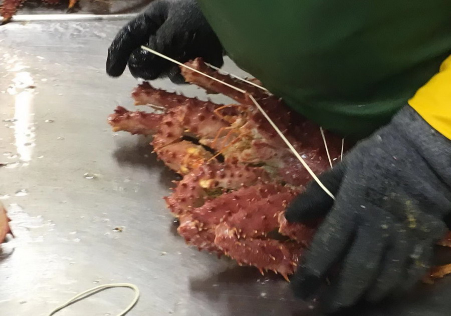 據(jù)介紹,蜘蛛蟹是用一種鐵籠子放入深海誘捕的,智利政府規(guī)定,小于1.5公斤的不許捕撈,因此,鐵籠的孔隙會放走幼小的蜘蛛蟹。李仁奇攝