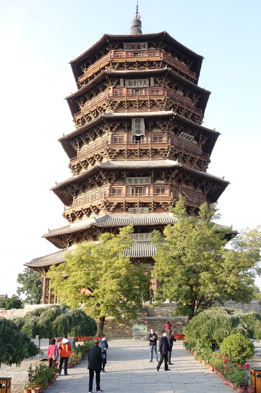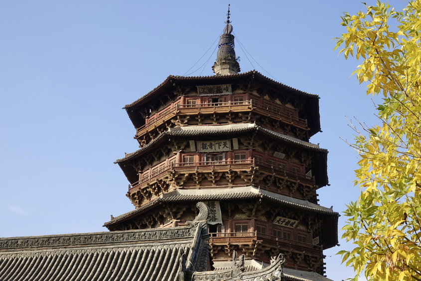 釋迦塔高67.31米,底層直徑30.27米,呈平面八角形。全塔用紅松木料3000立方米,重2600多噸,純木結(jié)構(gòu)、無(wú)釘無(wú)鉚。塔內(nèi)供奉著兩顆釋迦牟尼佛牙舍利。李仁奇攝