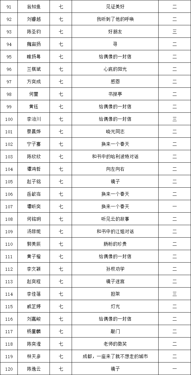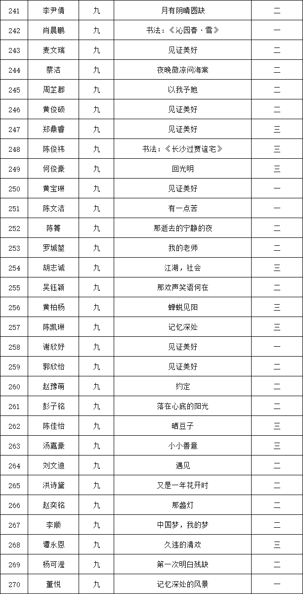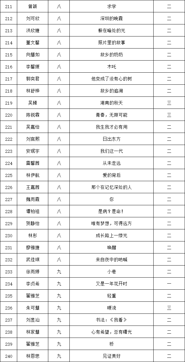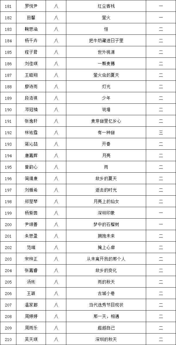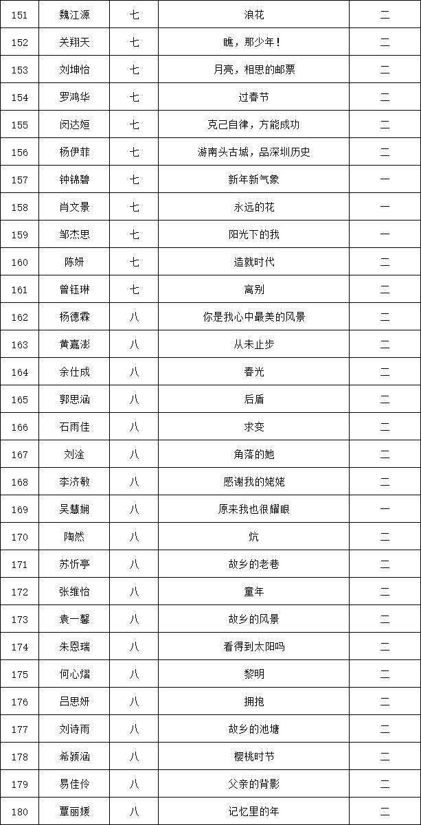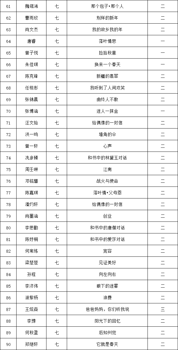 自2021年1月,活動(dòng)征稿啟動(dòng)以來,獲得了深圳市廣大中小學(xué)生、教師、文學(xué)愛好者的熱烈響應(yīng)積極參與,吸引了深圳百余所學(xué)校的上萬人關(guān)注報(bào)名?,F(xiàn)公布龍華區(qū)外國語學(xué)校專場晉級(jí)復(fù)賽名單如下: