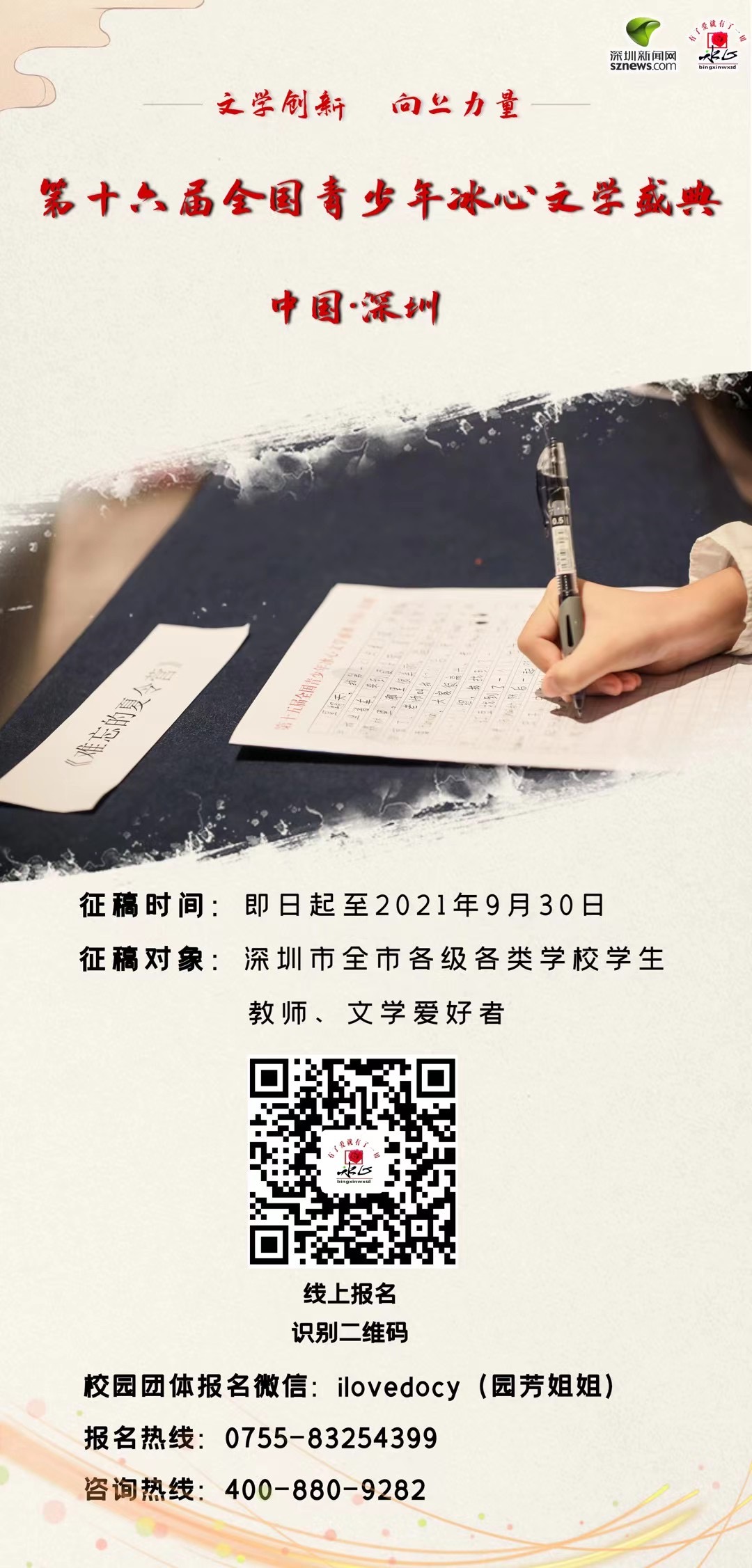 見圳客戶端·深圳新聞網(wǎng)2021年3月15日訊 為繼承和發(fā)揚(yáng)中華文化及冰心文學(xué)精神,促進(jìn)中華文化、中國現(xiàn)代化文學(xué)史更深入地植入深圳下一代青少年心中,2021年“第十六屆全國青少年冰心文學(xué)盛典中國·深圳”正在愛好文學(xué)的師生學(xué)友們之間熱烈展開。