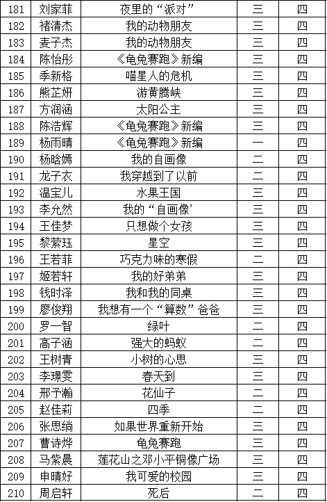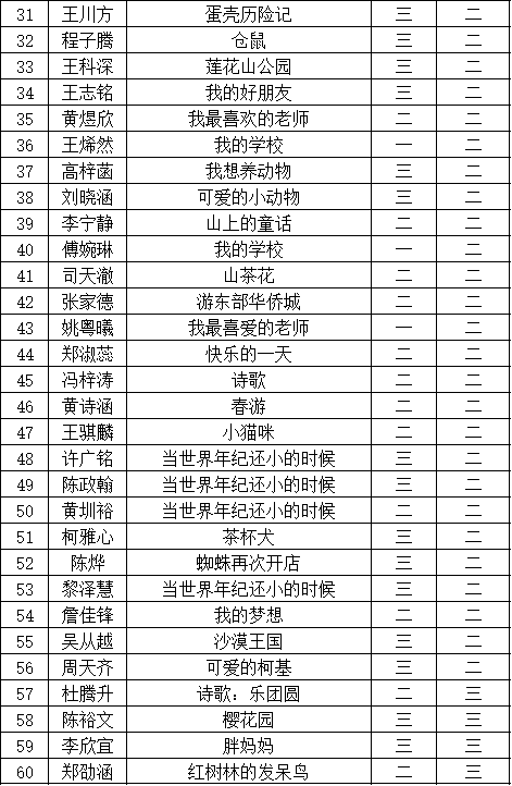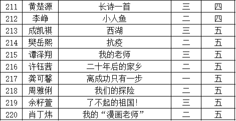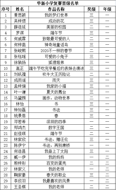 自2021年1月,活動(dòng)征稿啟動(dòng)以來,獲得了深圳市廣大中小學(xué)生、教師、文學(xué)愛好者的熱烈響應(yīng)積極參與,吸引了深圳百余所學(xué)校的上萬人關(guān)注報(bào)名。現(xiàn)公布福田區(qū)華新小學(xué)晉級(jí)復(fù)賽名單如下: