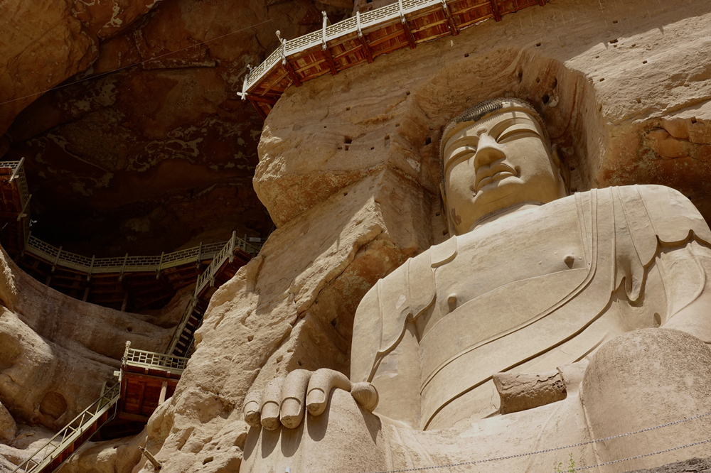 佛像左上方為169窟,169窟為一天然大洞穴,是現(xiàn)存最重要石窟,窟內(nèi)存西秦時的造像和壁畫。李仁奇 攝