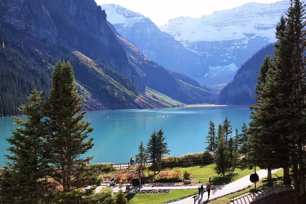 露易斯湖源自維多利亞冰川,湖水碧綠清澈,遠望就像鑲嵌在落基山脈中的一顆翡翠。李仁奇 攝