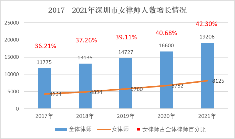 近年來深圳女律師人數(shù)快速增長,深圳律師隊(duì)伍“男多女少”的結(jié)構(gòu)正在改變,半邊天的態(tài)勢已經(jīng)呈現(xiàn),截至2021年底,全市律師共19206人,其中女律師8125人,占律師總?cè)藬?shù)的42.30%。