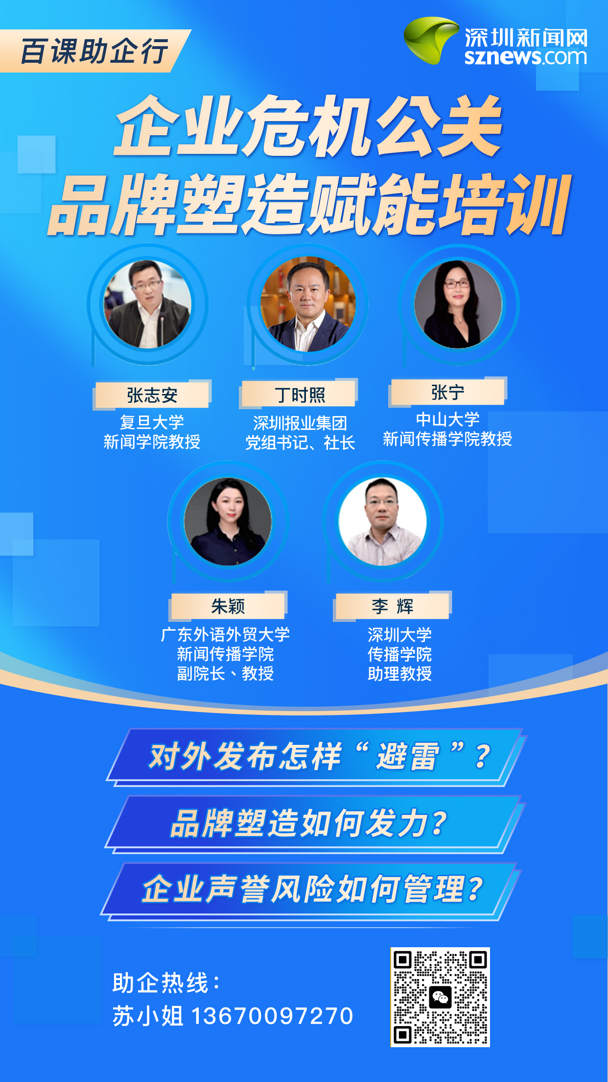 深圳新聞網(wǎng)以長期輿論研究及智庫服務(wù)經(jīng)驗(yàn)為支撐,不斷充實(shí)師資庫、豐富課程體系。目前,智庫團(tuán)隊(duì)包括復(fù)旦大學(xué)新聞學(xué)院教授張志安,深圳報(bào)業(yè)集團(tuán)黨組書記、社長丁時(shí)照,中國青年報(bào)編委曹林,中山大學(xué)新聞傳播學(xué)院教授張寧,廣東外語外貿(mào)大學(xué)新聞傳播學(xué)院副院長、教授朱穎,深圳大學(xué)傳播學(xué)院助理教授李輝等近百位來自公共關(guān)系、新聞傳播領(lǐng)域?qū)<摇?/p>