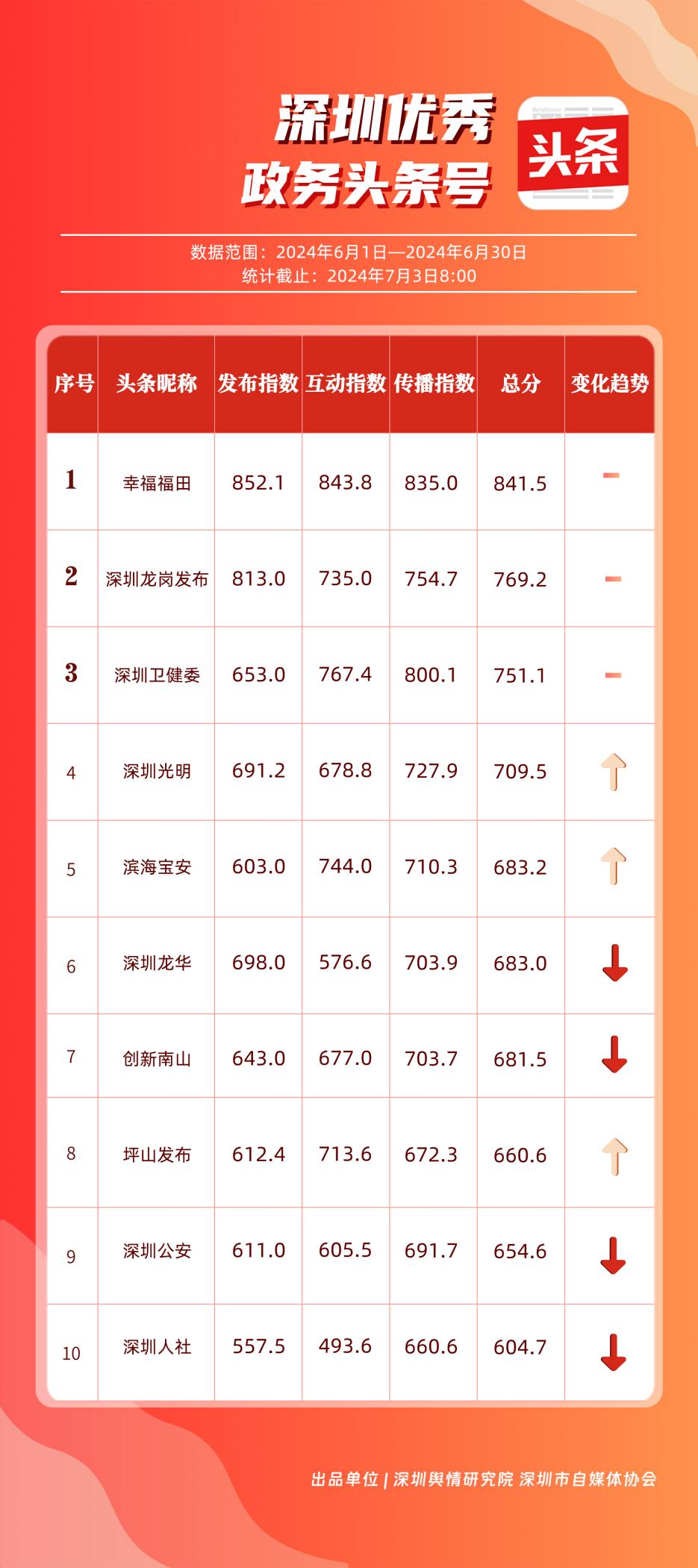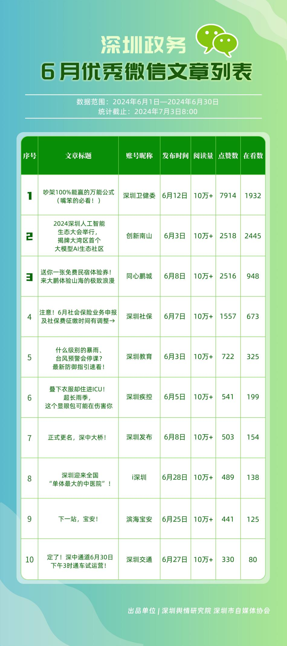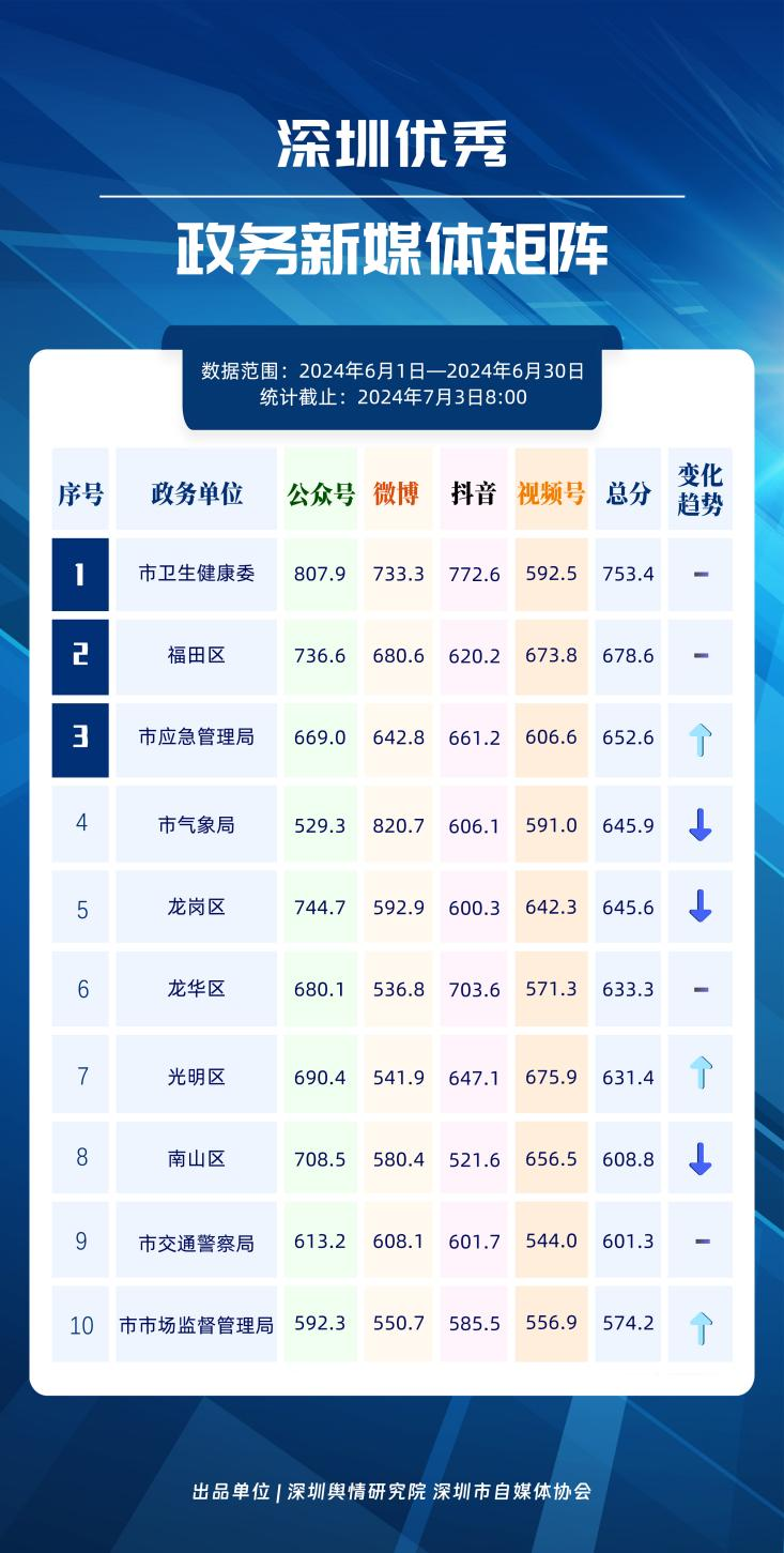 6月,“深圳衛(wèi)健委”“i深圳”“深圳龍崗發(fā)布”“幸福福田”“深圳交通”“深圳教育”“濱海寶安”“創(chuàng)新南山”“深圳工會(huì)”“青春深圳”“同心鵬城”“深圳光明”等30個(gè)政務(wù)微信公眾號(hào),被評(píng)為“深圳優(yōu)秀政務(wù)微信公眾號(hào)”。6月,“深圳衛(wèi)健委”因內(nèi)容策劃出色、受眾互動(dòng)活躍、作品火熱“出圈”等,榮登排行榜首位?!皠?chuàng)新南山”“同心鵬城”“深圳社保”“深圳教育”等上榜公眾號(hào)也積極創(chuàng)作優(yōu)質(zhì)作品,抓住時(shí)下熱點(diǎn)趨勢(shì),集中發(fā)揮政務(wù)媒體傳播力量,推動(dòng)了政務(wù)信息傳播工作提質(zhì)增效。