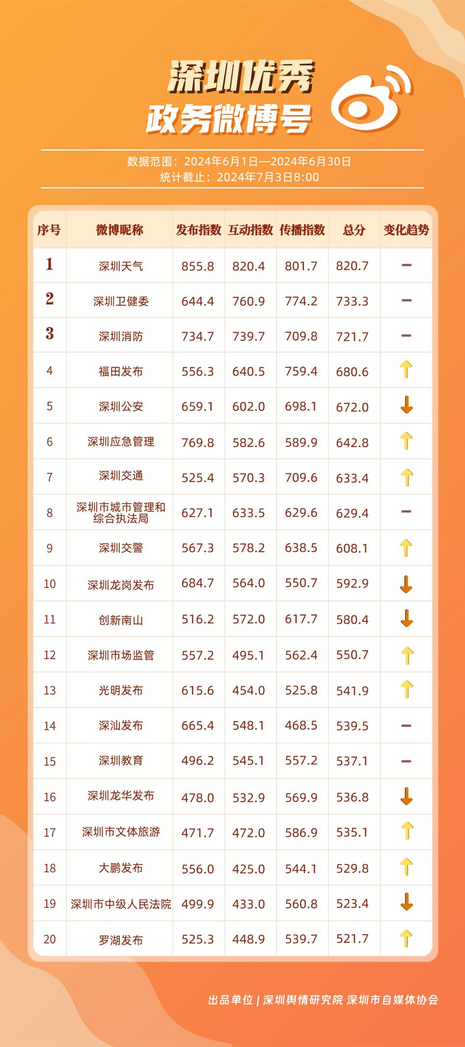 6月,“深圳天氣”“深圳衛(wèi)健委”“深圳消防”“福田發(fā)布”“深圳公安”“深圳應(yīng)急管理”“深圳交通”“深圳市城市管理和綜合執(zhí)法局”“深圳交警”“深圳龍崗發(fā)布”等20個(gè)政務(wù)微博號(hào)入列“優(yōu)秀”名單。“深圳天氣”“深圳衛(wèi)健委”“深圳消防”等賬號(hào)抓住微博平臺(tái)的傳播特征,持續(xù)輸出優(yōu)質(zhì)內(nèi)容,滿足受眾需求,不斷提高用戶體驗(yàn)和傳播效果。