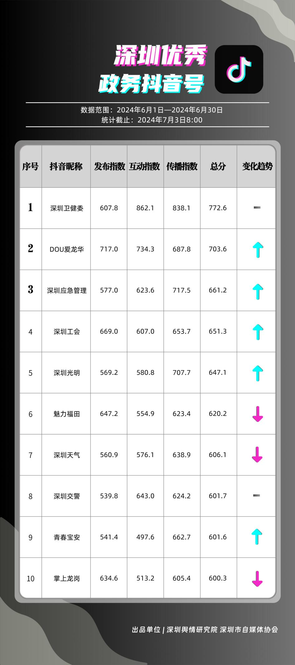 榜單在持續(xù)展示深圳政務(wù)新媒體矩陣建設(shè)成效的同時(shí),梳理總結(jié)了深圳政務(wù)微信公眾號(hào)、微信視頻號(hào)、微博號(hào)、抖音號(hào)、頭條號(hào)的運(yùn)營(yíng)方法與經(jīng)驗(yàn),是政務(wù)公開、回應(yīng)群眾關(guān)切的重要載體。6月,又有哪些政務(wù)新媒體取得優(yōu)異成績(jī)呢?《深圳優(yōu)秀政務(wù)新媒體矩陣》(2024年6月期)邀您共同關(guān)注。