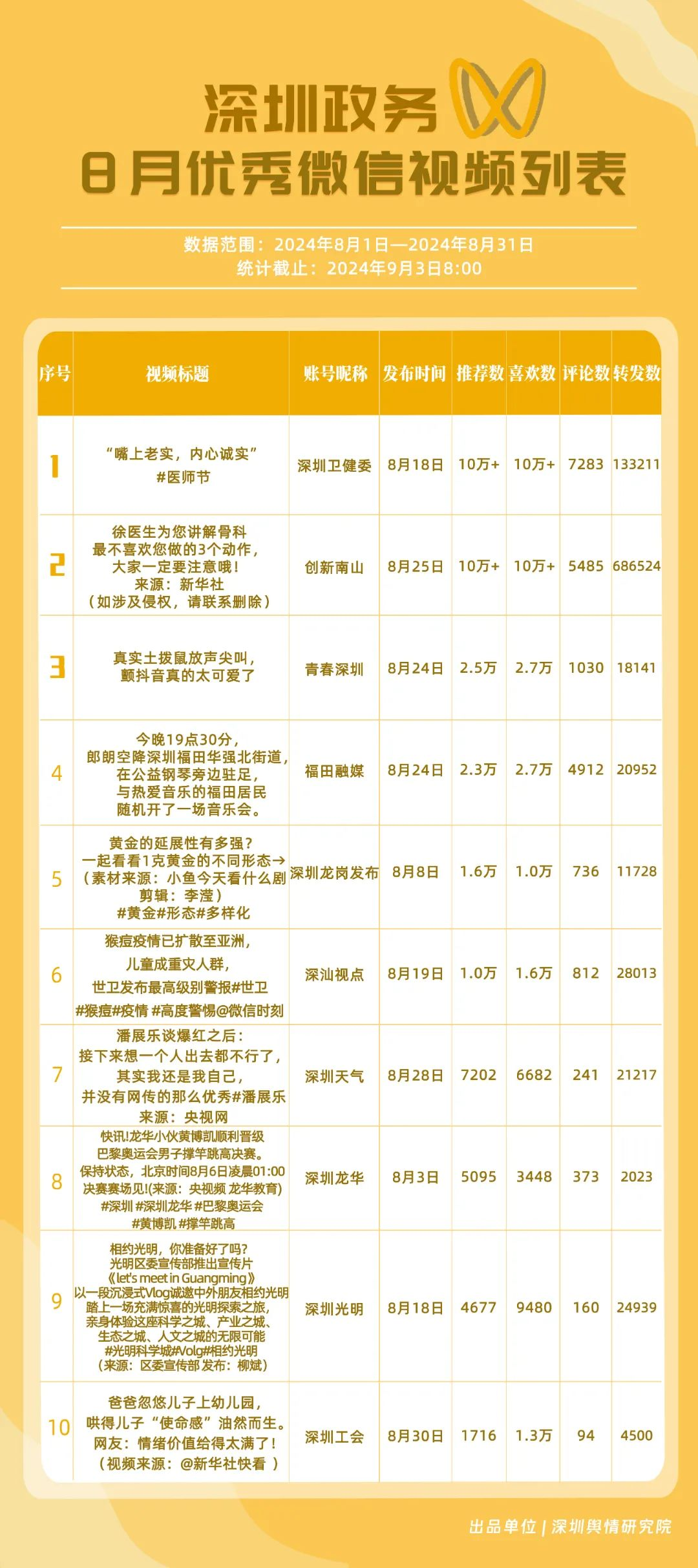 8月,獲“深圳優(yōu)秀政務(wù)微信視頻號(hào)”稱號(hào)的分別是“創(chuàng)新南山”“深圳衛(wèi)健委”“福田融媒”“深汕視點(diǎn)”“深圳龍崗發(fā)布”“青春深圳”“深圳天氣”“深圳光明”“深圳工會(huì)”和“深圳公安”。微信視頻號(hào)方面,多賬號(hào)以原創(chuàng)內(nèi)容吸引了大量關(guān)注,如“郎朗空降深圳華強(qiáng)北”“深圳坪山長守戲劇谷”等,展示了深圳的文化魅力和城市活力,也有賬號(hào)轉(zhuǎn)載網(wǎng)絡(luò)熱門視頻,以其實(shí)用性、趣味性獲得了網(wǎng)民的推薦和點(diǎn)贊。