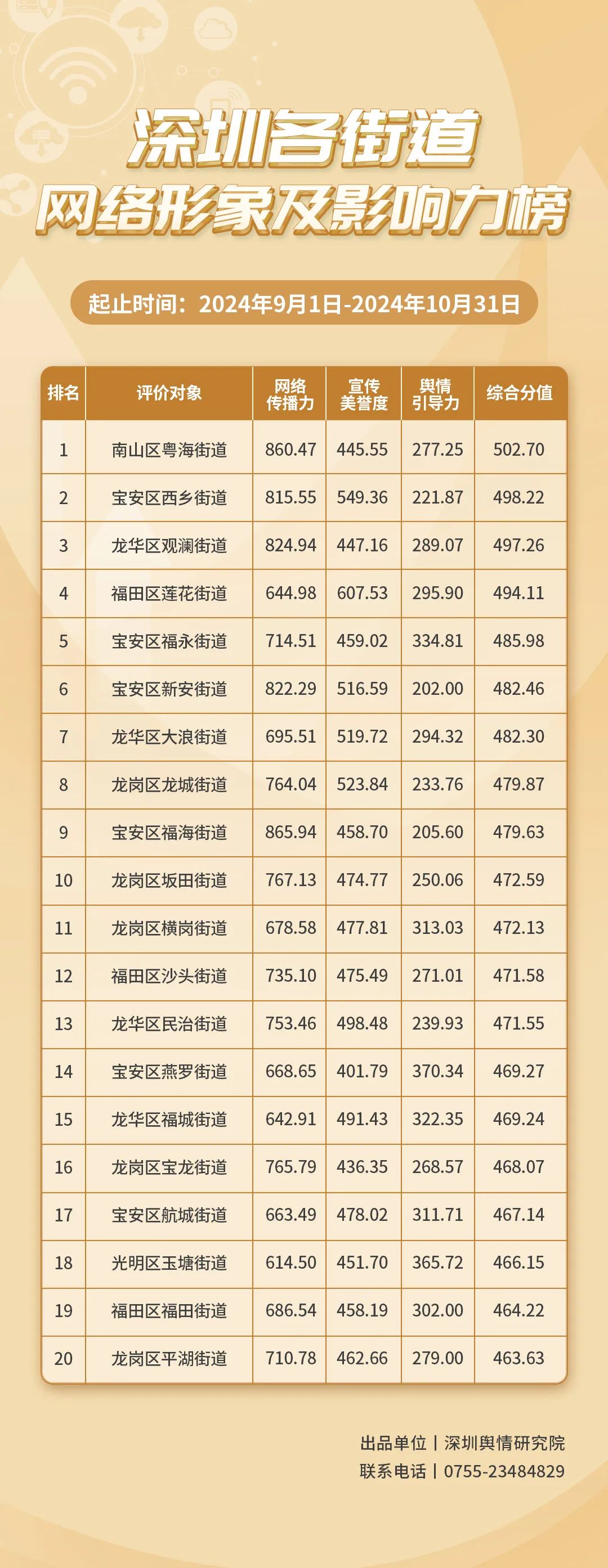 2024年9-10月,各街道不斷探索治理新路徑,力求效能躍升,《深圳各街道網(wǎng)絡形象及影響力榜》為您揭曉哪些街道網(wǎng)絡形象治理實效顯著,成標桿,本期榜單數(shù)據(jù)統(tǒng)計范圍為2024年9月1日至10月31日。