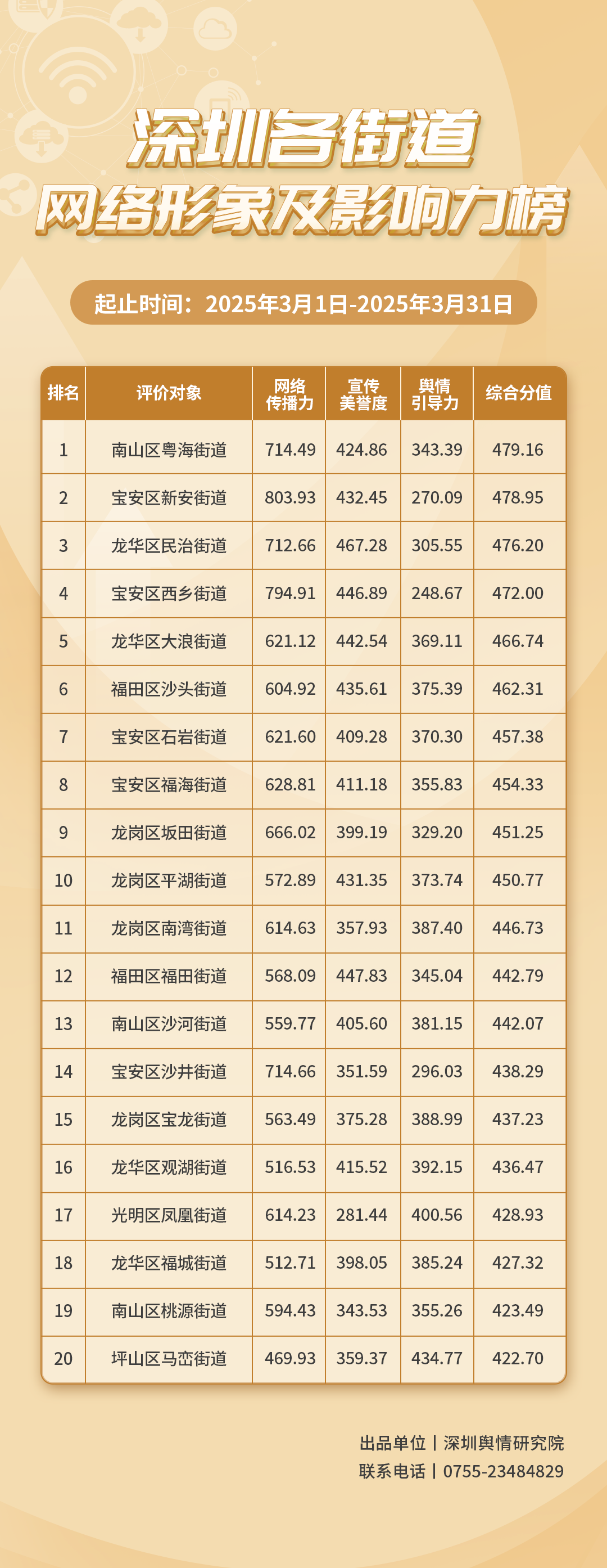 2025年3月,共有20個街道登上《深圳各街道網(wǎng)絡形象及影響力榜》,分別是:南山區(qū)粵海街道、寶安區(qū)新安街道、龍華區(qū)民治街道、寶安區(qū)西鄉(xiāng)街道、龍華區(qū)大浪街道、福田區(qū)沙頭街道、寶安區(qū)石巖街道、寶安區(qū)福海街道、龍崗區(qū)坂田街道、龍崗區(qū)平湖街道、龍崗區(qū)南灣街道、福田區(qū)福田街道、南山區(qū)沙河街道、寶安區(qū)沙井街道、龍崗區(qū)寶龍街道、龍華區(qū)觀湖街道、光明區(qū)鳳凰街道、龍華區(qū)福城街道、南山區(qū)桃源街道、坪山區(qū)馬巒街道。
