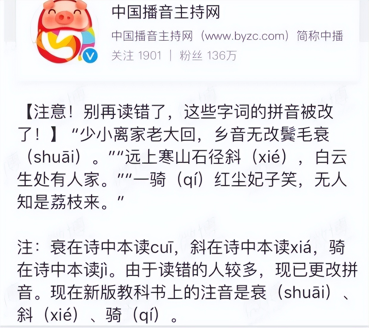 中國播音主持網(wǎng)就科普了很多被修訂的讀音