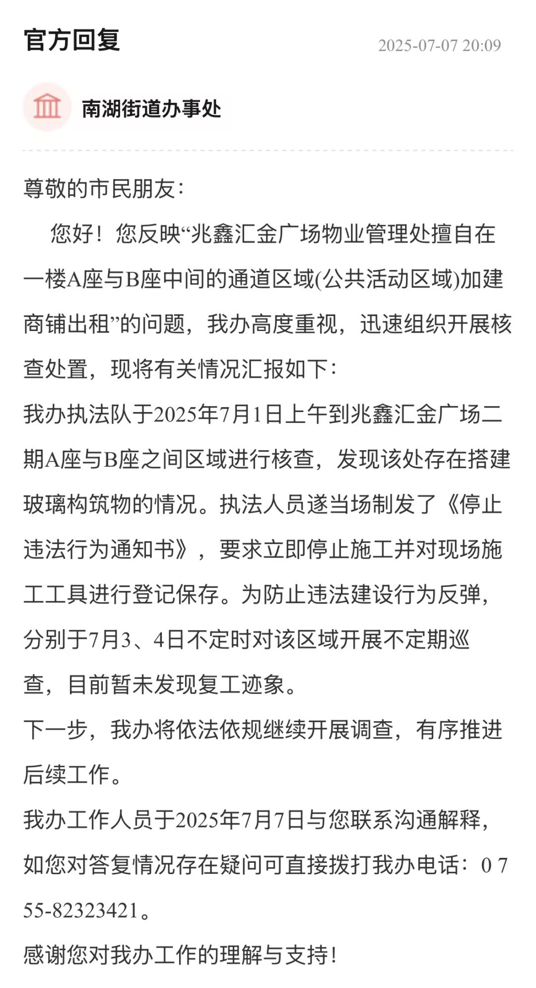 從市民反饋到執(zhí)法處置,羅湖區(qū)南湖街道辦事處以快速響應(yīng)、精準執(zhí)法展現(xiàn)治理效能。通過現(xiàn)場核查、制發(fā)《停止違法行為通知書》、登記保存施工工具等措施,及時遏制違法搭建勢頭,并建立不定期巡查機制防止反彈。從“即時制止”到“長效監(jiān)督”的閉環(huán)管理,維護了業(yè)主合法權(quán)益與消防通道安全,為城市違建治理提供了高效務(wù)實的實踐樣本,彰顯基層執(zhí)法部門守護民生安全的責(zé)任擔(dān)當。