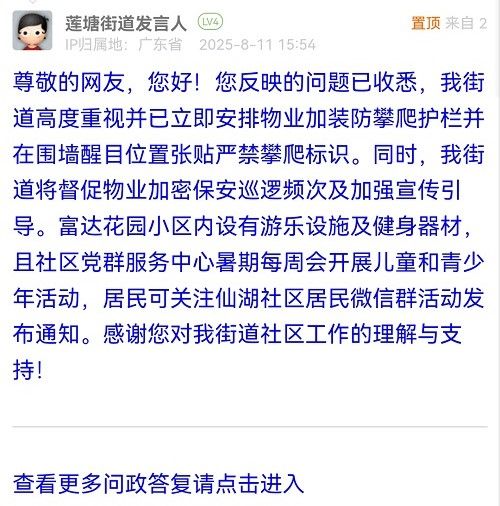 尊敬的網(wǎng)友,您好!您反映的問題已收悉,我街道高度重視并已立即安排物業(yè)加裝防攀爬護欄并在圍墻醒目位置張貼嚴(yán)禁攀爬標(biāo)識。同時,我街道將督促物業(yè)加密保安巡邏頻次及加強宣傳引導(dǎo)。富達(dá)花園小區(qū)內(nèi)設(shè)有游樂設(shè)施及健身器材,且社區(qū)黨群服務(wù)中心暑期每周會開展兒童和青少年活動,居民可關(guān)注仙湖社區(qū)居民微信群活動發(fā)布通知。感謝您對我街道社區(qū)工作的理解與支持!