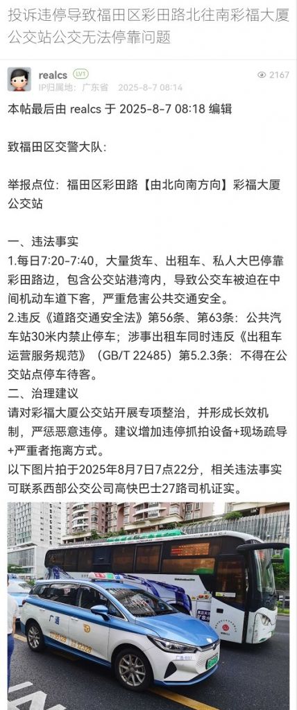 16. 帖文《投訴違停導(dǎo)致福田區(qū)彩田路北往南彩福大廈公交站公交無法停靠問題》