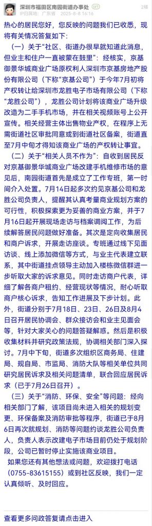 (二)關(guān)于“相關(guān)人員不作為”:自收到居民反對京基御景華城商業(yè)廣場改建手機維修市場的意見后,南園街道首先是成立了工作專班,第一時間介入處置。7月14日起多次約見京基公司和龍勝公司負(fù)責(zé)人,提醒其認(rèn)真考量商業(yè)規(guī)劃方案的可行性,積極探索更為妥善的商業(yè)方案,并于7月16日起開展現(xiàn)場走訪與檔案調(diào)閱工作,為后續(xù)解答居民問題做好準(zhǔn)備。其次是定向收集居民和商戶訴求,開展走訪座談。專班通過線下見面訪談、線上添加微信等方式,與業(yè)主代表建立聯(lián)系,其中街道掛點領(lǐng)導(dǎo)主動加入樓棟微信群進一步聽取大家的訴求意見。同時走訪商戶代表,詳細(xì)了解各商戶租約、經(jīng)營現(xiàn)狀等情況,耐心聽取商戶核心訴求,告知工作進展及下步計劃。此外,街道分別于7月18日、23日、26日及8月4日召開居民協(xié)調(diào)會、群眾接訪會和業(yè)主見面會等,針對大家關(guān)心的問題答疑解惑。然后是積極收集材料并研究政策法規(guī),協(xié)調(diào)相關(guān)部門深入探討。7月中下旬,街道多次組織區(qū)商務(wù)局、住建局、規(guī)自局、市監(jiān)局、消防大隊等相關(guān)單位共同研究居民訴求及相關(guān)問題清單,聯(lián)合回應(yīng)居民訴求(已于7月26日召開)。