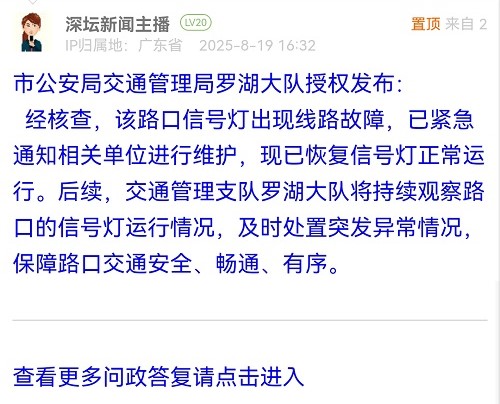 經(jīng)核查,該路口信號燈出現(xiàn)線路故障,已緊急通知相關(guān)單位進行維護,現(xiàn)已恢復信號燈正常運行。后續(xù),交通管理支隊羅湖大隊將持續(xù)觀察路口的信號燈運行情況,及時處置突發(fā)異常情況,保障路口交通安全、暢通、有序。