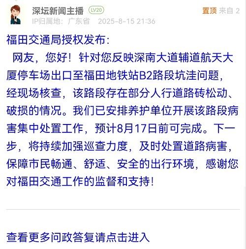 網(wǎng)友,您好!針對您反映深南大道輔道航天大廈停車場出口至福田地鐵站B2路段坑洼問題,經(jīng)現(xiàn)場核查,該路段存在部分人行道路磚松動、破損的情況。我們已安排養(yǎng)護單位開展該路段病害集中處置工作,預計8月17日前可完成。下一步,將持續(xù)加強巡查力度,及時處置道路病害,保障市民暢通、舒適、安全的出行環(huán)境,感謝您對福田交通工作的監(jiān)督和支持!