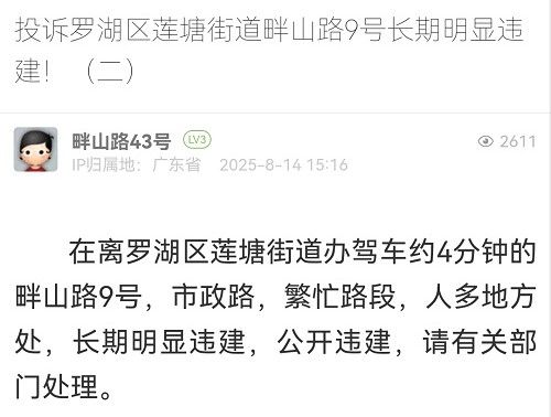 14. 帖文《投訴羅湖區(qū)蓮塘街道畔山路9號長期明顯違建!(二)》
