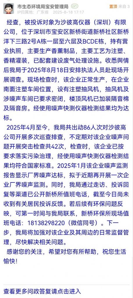 經(jīng)查,被投訴對象為沙彼高儀器(深圳)有限公司,位于深圳市寶安區(qū)新橋街道新橋社區(qū)新橋洋下三路2號A棟一層至六層及BCDE棟,持有營業(yè)執(zhí)照,主要生產(chǎn)香薰制品,主要工藝為注塑、香精灌裝,已配套建設(shè)廢氣處理設(shè)施。收悉輿情后我局于2025年8月18日安排執(zhí)法人員赴現(xiàn)場開展調(diào)查。現(xiàn)場檢查時,該企業(yè)正常生產(chǎn),在企業(yè)南面注塑車間位置,設(shè)有注塑抽風機,抽風機及涉噪聲車間已要求密閉,樓頂風機已加裝隔音棉及隔音房。經(jīng)使用噪聲快測儀器檢測結(jié)果均為達標。