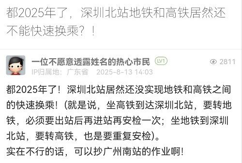 10. 帖文《都2025年了,深圳北站地鐵和高鐵居然還不能快速換乘?!》