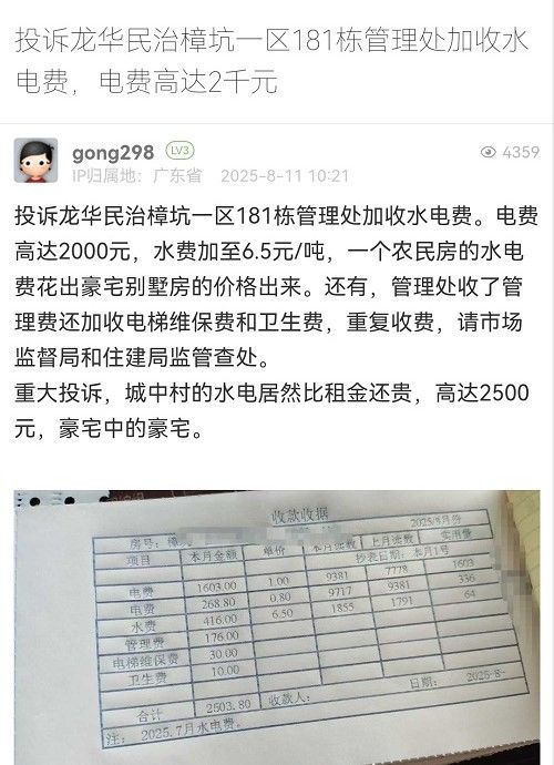 1. 帖文《投訴龍華民治樟坑一區(qū)181棟管理處加收水電費,電費高達2千元》