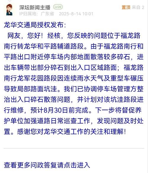 網(wǎng)友,您好!經(jīng)核,您反映的問題位于福龍路南行轉(zhuǎn)龍華和平路輔道路段。由于福龍路南行和平路出口附近停車場內(nèi)部地面散落較多碎石,進出車輛帶出部分碎石到出入口區(qū)域路面;福龍路南行龍軍花園路段因連續(xù)雨水天氣及重型車碾壓導致局部路面坑洼。我們已協(xié)調(diào)停車場管理方整治出入口碎石散落問題,并計劃對該坑洼路段進行維修,預計8月30日前完成。下一步將督促養(yǎng)護單位加強道路日常巡查工作,發(fā)現(xiàn)問題及時處置。感謝您對龍華交通工作的關(guān)注和理解!