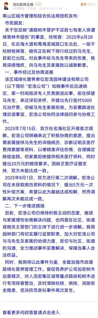 關(guān)于您反映“道路樹木管護不足致七旬老人突遭掉落林木砸傷”的事宜,經(jīng)核查:2025年6月28日,在后海大道和粵海龍城路口東北處,一段干枯樹枝掉落,砸傷正在樹下騎行經(jīng)過的馬先生,目前已出院。對此事件給馬先生帶來的傷害,我局深感愧疚,向馬先生及家屬致以誠摯歉意。