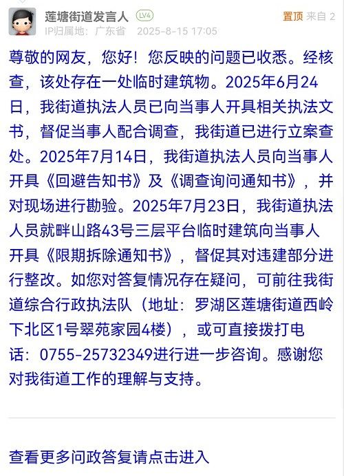 尊敬的網(wǎng)友,您好!您反映的問題已收悉。經(jīng)核查,該處存在一處臨時建筑物。2025年6月24日,我街道執(zhí)法人員已向當事人開具相關(guān)執(zhí)法文書,督促當事人配合調(diào)查,我街道已進行立案查處。2025年7月14日,我街道執(zhí)法人員向當事人開具《回避告知書》及《調(diào)查詢問通知書》,并對現(xiàn)場進行勘驗。2025年7月23日,我街道執(zhí)法人員就畔山路43號三層平臺臨時建筑向當事人開具《限期拆除通知書》,督促其對違建部分進行整改。如您對答復情況存在疑問,可前往我街道綜合行政執(zhí)法隊(地址:羅湖區(qū)蓮塘街道西嶺下北區(qū)1號翠苑家園4樓),或可直接撥打電話:0755-25732349進行進一步咨詢。感謝您對我街道工作的理解與支持。