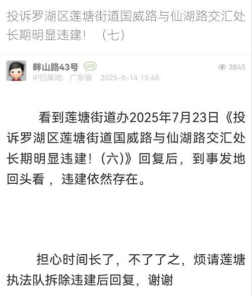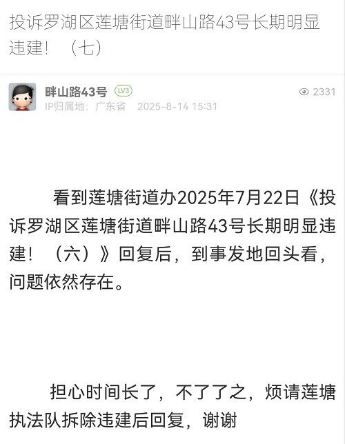 15. 帖文《投訴羅湖區(qū)蓮塘街道畔山路43號長期明顯違建!(七)》