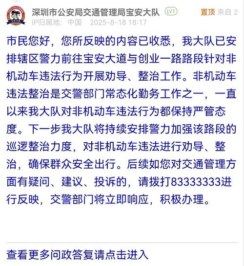 市民您好,您所反映的內(nèi)容已收悉,我大隊已安排轄區(qū)警力前往寶安大道與創(chuàng)業(yè)一路路段針對非機動車違法行為開展勸導、整治工作。非機動車違法整治是交警部門常態(tài)化勤務工作之一,一直以來我大隊對非機動車違法行為都保持嚴管態(tài)度。下一步我大隊將持續(xù)安排警力加強該路段的巡邏整治力度,對非機動車違法進行勸導、整治,確保群眾安全出行。后續(xù)如您對交通管理方面有疑問、建議、投訴的,請撥打83333333進行反映,交警部門將立即響應,積極辦理。