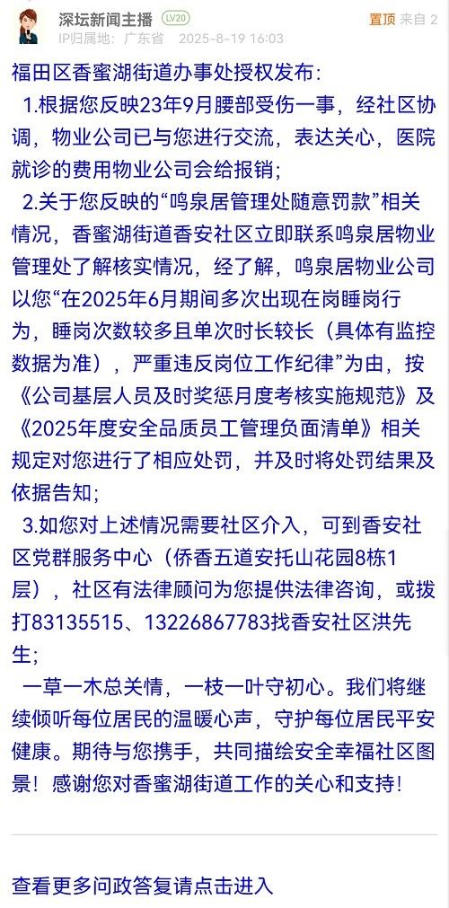2.關(guān)于您反映的“鳴泉居管理處隨意罰款”相關(guān)情況,香蜜湖街道香安社區(qū)立即聯(lián)系鳴泉居物業(yè)管理處了解核實情況,經(jīng)了解,鳴泉居物業(yè)公司以您“在2025年6月期間多次出現(xiàn)在崗睡崗行為,睡崗次數(shù)較多且單次時長較長(具體有監(jiān)控數(shù)據(jù)為準),嚴重違反崗位工作紀律”為由,按《公司基層人員及時獎懲月度考核實施規(guī)范》及《2025年度安全品質(zhì)員工管理負面清單》相關(guān)規(guī)定對您進行了相應處罰,并及時將處罰結(jié)果及依據(jù)告知;