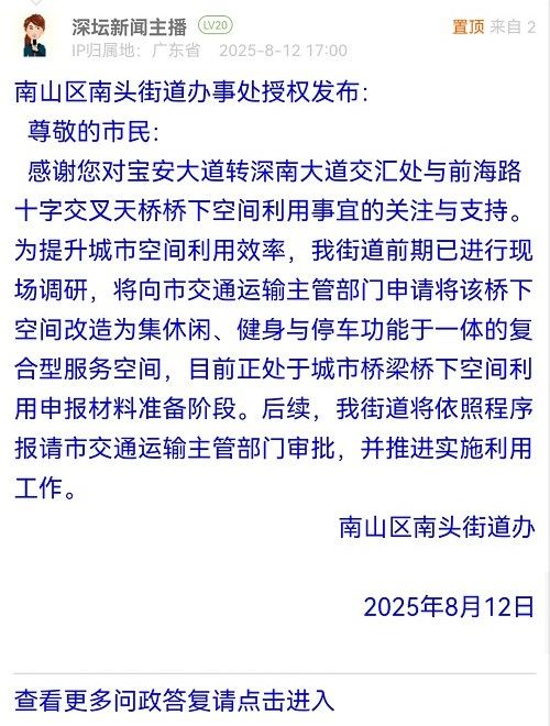 感謝您對寶安大道轉(zhuǎn)深南大道交匯處與前海路十字交叉天橋橋下空間利用事宜的關(guān)注與支持。為提升城市空間利用效率,我街道前期已進行現(xiàn)場調(diào)研,將向市交通運輸主管部門申請將該橋下空間改造為集休閑、健身與停車功能于一體的復合型服務空間,目前正處于城市橋梁橋下空間利用申報材料準備階段。后續(xù),我街道將依照程序報請市交通運輸主管部門審批,并推進實施利用工作。