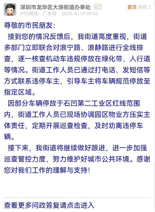 接到您的情況反饋后,我街道高度重視,街道多部門立即聯(lián)合對浪寧路、浪靜路進行全線排查,逐一核查機動車違規(guī)停放在綠化帶、人行道等情況。街道工作人員已通過打電話、發(fā)短信等方式聯(lián)系違停車主,引導車主將車輛規(guī)范停放至指定區(qū)域。