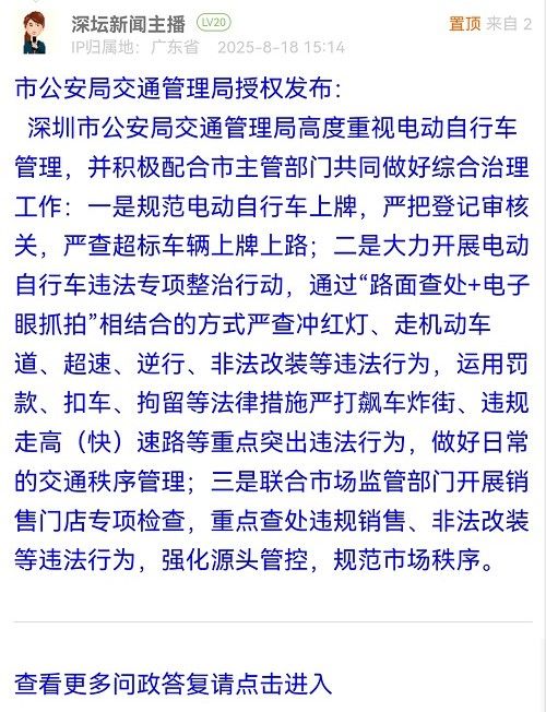 深圳市公安局交通管理局高度重視電動自行車管理,并積極配合市主管部門共同做好綜合治理工作:一是規(guī)范電動自行車上牌,嚴把登記審核關(guān),嚴查超標車輛上牌上路;二是大力開展電動自行車違法專項整治行動,通過“路面查處+電子眼抓拍”相結(jié)合的方式嚴查沖紅燈、走機動車道、超速、逆行、非法改裝等違法行為,運用罰款、扣車、拘留等法律措施嚴打飆車炸街、違規(guī)走高(快)速路等重點突出違法行為,做好日常的交通秩序管理;三是聯(lián)合市場監(jiān)管部門開展銷售門店專項檢查,重點查處違規(guī)銷售、非法改裝等違法行為,強化源頭管控,規(guī)范市場秩序。