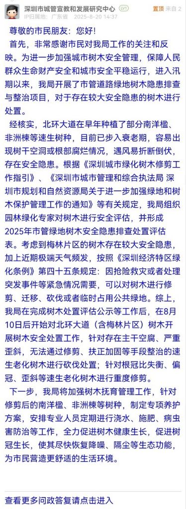 經(jīng)核實,北環(huán)大道在早年種植了部分南洋楹、非洲楝等速生樹種,目前已步入衰老期,容易出現(xiàn)樹干空洞或根部腐爛情況,遇風易折斷倒伏,存在安全隱患。根據(jù)《深圳城市綠化樹木修剪工作指引》、《深圳市城市管理和綜合執(zhí)法局 深圳市規(guī)劃和自然資源局關(guān)于進一步加強綠地和樹木保護管理工作的通知》等有關(guān)規(guī)定,我局組織園林綠化專家對樹木進行安全評估,并形成2025年市管綠地樹木安全隱患排查處置評估表??紤]到梅林片區(qū)的樹木存在較大安全隱患,加上近期極端天氣頻發(fā),按照《深圳經(jīng)濟特區(qū)綠化條例》第四十五條規(guī)定:因搶險救災或者處理突發(fā)事件等緊急情況需要,可以對樹木進行修剪、遷移、砍伐或者臨時占用公共綠地。綜上,我局在完成樹木處置評估公示等工作后,在8月10日后開始對北環(huán)大道(含梅林片區(qū))樹木開展樹木安全處置工作,針對存在主干空腐、嚴重歪斜,無法通過修剪、扶正加固等手段整治的速生老化樹木進行砍伐處置;針對根冠比失衡、偏冠、歪斜等速生老化樹木進行重度修剪。