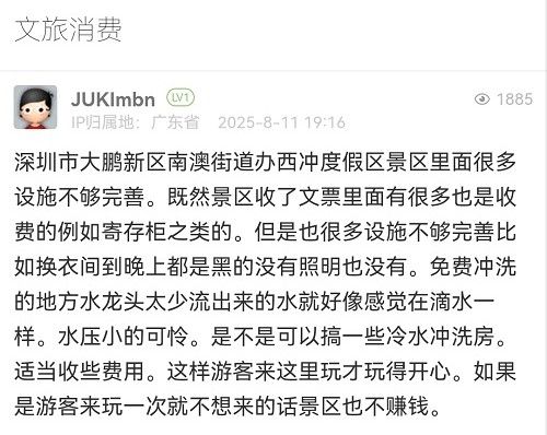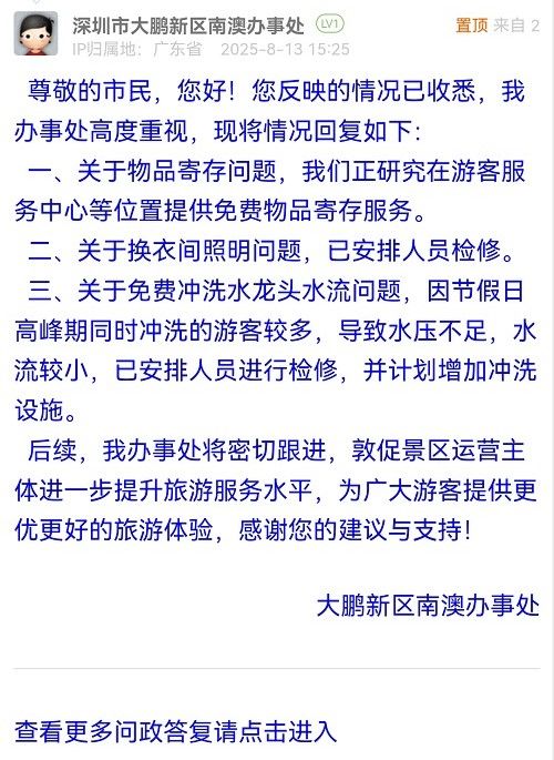 三、關(guān)于免費沖洗水龍頭水流問題,因節(jié)假日高峰期同時沖洗的游客較多,導致水壓不足,水流較小,已安排人員進行檢修,并計劃增加沖洗設(shè)施。