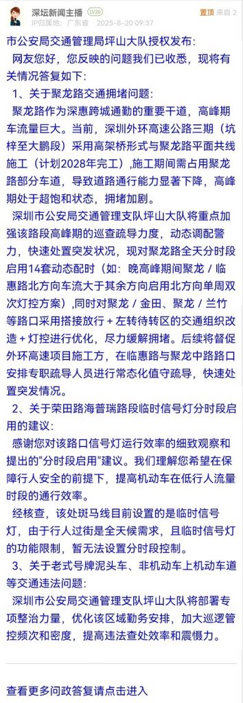 深圳市公安局交通管理支隊坪山大隊將重點加強該路段高峰期的巡查疏導力度,動態(tài)調(diào)配警力,快速處置突發(fā)狀況,現(xiàn)對聚龍路全天分時段啟用14套動態(tài)配時(如:晚高峰期間聚龍/臨惠路北方向車流大于其余方向啟用北方向單周雙次燈控方案),同時對聚龍/金田、聚龍/蘭竹等路口采用搭接放行+左轉(zhuǎn)待轉(zhuǎn)區(qū)的交通組織改造+燈控進行優(yōu)化,盡力緩解擁堵。后續(xù)將督促外環(huán)高速項目施工方,在臨惠路與聚龍中路路口安排專職疏導人員進行常態(tài)化值守疏導,快速處置突發(fā)情況。