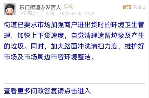 街道已要求市場加強商戶進出貨時的環(huán)境衛(wèi)生管理,加快上下貨速度,自覺清理遺留垃圾及產(chǎn)生的垃圾。同時,加大路面沖洗清掃力度,維護好市場及市場周邊市容環(huán)境整潔。