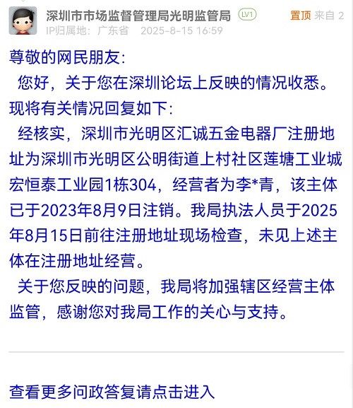 尊敬的網(wǎng)民朋友:您好,關(guān)于您在深圳論壇上反映的情況收悉?,F(xiàn)將有關(guān)情況回復如下:經(jīng)核實,深圳市光明區(qū)匯誠五金電器廠注冊地址為深圳市光明區(qū)公明街道上村社區(qū)蓮塘工業(yè)城宏恒泰工業(yè)園1棟304,經(jīng)營者為李*青,該主體已于2023年8月9日注銷。我局執(zhí)法人員于2025年8月15日前往注冊地址現(xiàn)場檢查,未見上述主體在注冊地址經(jīng)營。關(guān)于您反映的問題,我局將加強轄區(qū)經(jīng)營主體監(jiān)管,感謝您對我局工作的關(guān)心與支持。