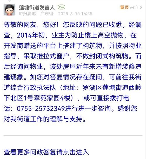 尊敬的網(wǎng)友,您好!您反映的問題已收悉。經(jīng)調(diào)查,2014年初,業(yè)主為防止樓上高空拋物,在開發(fā)商贈送的平臺上搭建了構(gòu)筑物,并按照物業(yè)指導,采取推拉式窗戶,不做封閉式構(gòu)筑物。而后經(jīng)詢問物業(yè),該處房屋近年來未有新增裝修違建現(xiàn)象。如您對答復情況存在疑問,可前往我街道綜合行政執(zhí)法隊(地址:羅湖區(qū)蓮塘街道西嶺下北區(qū)1號翠苑家園4樓),或可直接撥打電話:0755-25732349進行進一步咨詢。感謝您對我街道工作的理解與支持。