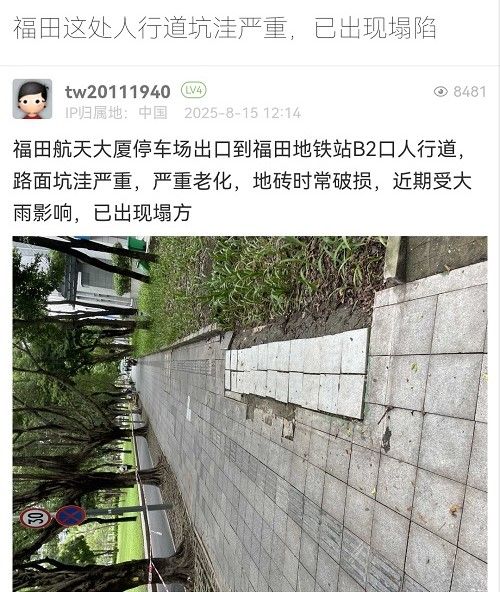 19. 帖文《福田這處人行道坑洼嚴重,已出現(xiàn)塌陷》