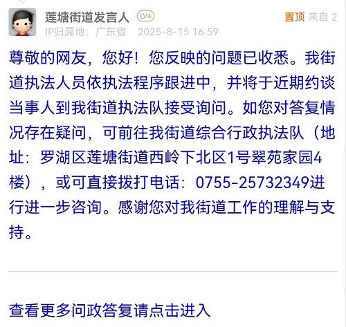尊敬的網(wǎng)友,您好!您反映的問題已收悉。我街道執(zhí)法人員依執(zhí)法程序跟進中,并將于近期約談當事人到我街道執(zhí)法隊接受詢問。如您對答復情況存在疑問,可前往我街道綜合行政執(zhí)法隊(地址:羅湖區(qū)蓮塘街道西嶺下北區(qū)1號翠苑家園4樓),或可直接撥打電話:0755-25732349進行進一步咨詢。感謝您對我街道工作的理解與支持。