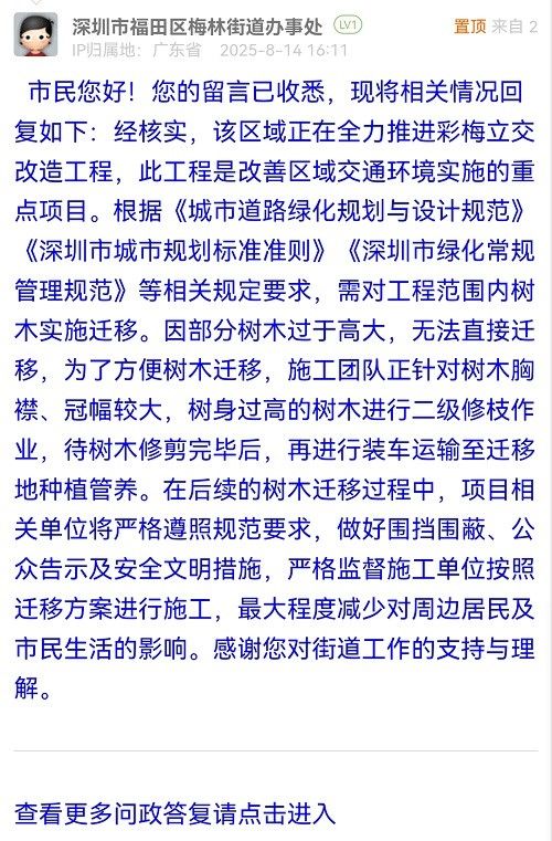 市民您好!您的留言已收悉,現(xiàn)將相關(guān)情況回復如下:經(jīng)核實,該區(qū)域正在全力推進彩梅立交改造工程,此工程是改善區(qū)域交通環(huán)境實施的重點項目。根據(jù)《城市道路綠化規(guī)劃與設(shè)計規(guī)范》《深圳市城市規(guī)劃標準準則》《深圳市綠化常規(guī)管理規(guī)范》等相關(guān)規(guī)定要求,需對工程范圍內(nèi)樹木實施遷移。因部分樹木過于高大,無法直接遷移,為了方便樹木遷移,施工團隊正針對樹木胸襟、冠幅較大,樹身過高的樹木進行二級修枝作業(yè),待樹木修剪完畢后,再進行裝車運輸至遷移地種植管養(yǎng)。在后續(xù)的樹木遷移過程中,項目相關(guān)單位將嚴格遵照規(guī)范要求,做好圍擋圍蔽、公眾告示及安全文明措施,嚴格監(jiān)督施工單位按照遷移方案進行施工,最大程度減少對周邊居民及市民生活的影響。感謝您對街道工作的支持與理解。
