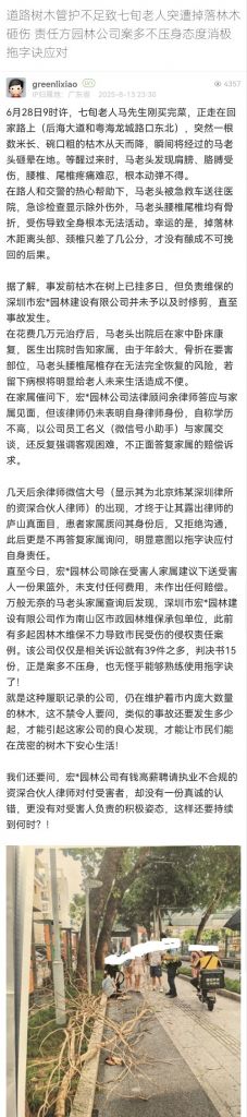 11. 帖文《道路樹木管護不足致七旬老人突遭掉落林木砸傷 責任方園林公司案多不壓身態(tài)度消極拖字訣應對》