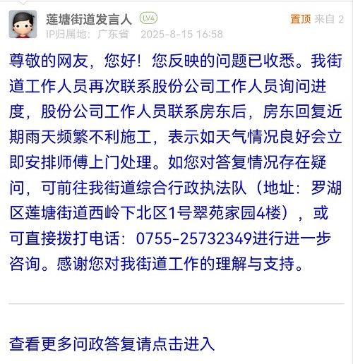 尊敬的網(wǎng)友,您好!您反映的問題已收悉。我街道工作人員再次聯(lián)系股份公司工作人員詢問進度,股份公司工作人員聯(lián)系房東后,房東回復近期雨天頻繁不利施工,表示如天氣情況良好會立即安排師傅上門處理。如您對答復情況存在疑問,可前往我街道綜合行政執(zhí)法隊(地址:羅湖區(qū)蓮塘街道西嶺下北區(qū)1號翠苑家園4樓),或可直接撥打電話:0755-25732349進行進一步咨詢。感謝您對我街道工作的理解與支持。