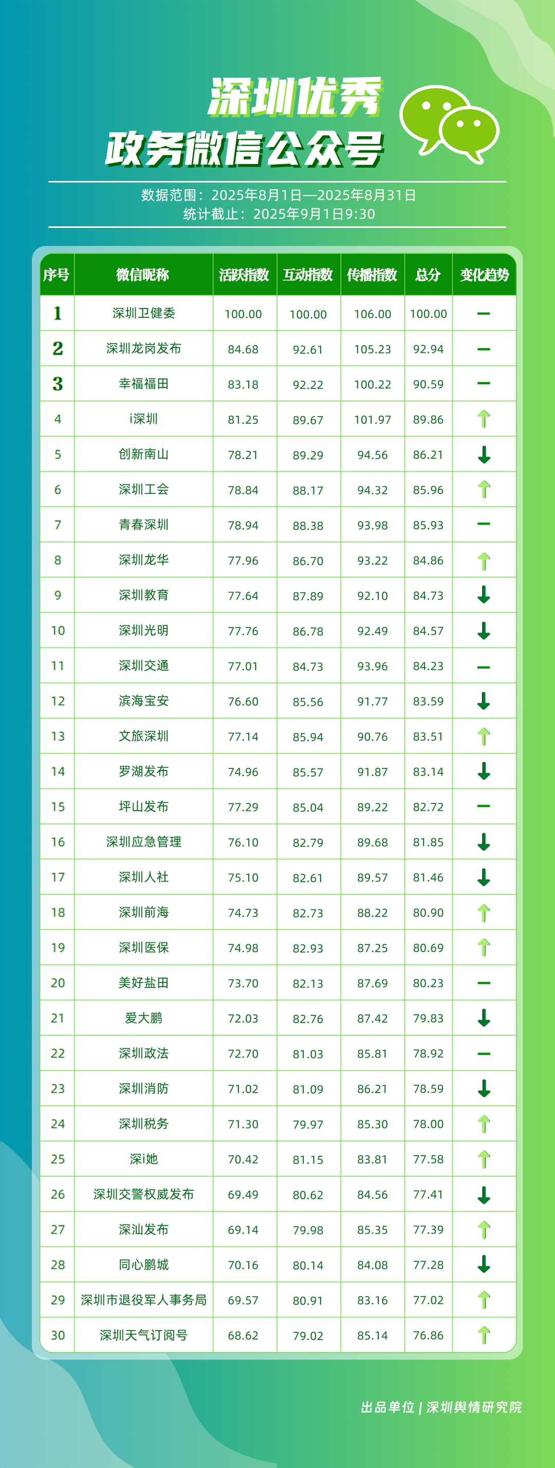 8月,30個(gè)政務(wù)微信公眾號(hào)入選“深圳優(yōu)秀政務(wù)微信公眾號(hào)”榜單,其中包括“深圳衛(wèi)健委”“深圳龍崗發(fā)布”“幸福福田”“i深圳”“創(chuàng)新南山”“深圳工會(huì)”“青春深圳”“深圳龍華”“深圳教育”“深圳光明”等。8月,“深圳衛(wèi)健委”66篇推文獲得超10萬次閱讀,以滿分位于榜單首位;“深圳龍崗發(fā)布”積極傳遞民生信息,依托區(qū)域活動(dòng)開展宣傳,推動(dòng)傳播效果顯著提升,位居第二;“幸福福田”關(guān)注區(qū)域發(fā)展動(dòng)態(tài),排名第三。“i深圳”“創(chuàng)新南山”“深圳工會(huì)”“青春深圳”等政務(wù)賬號(hào)在信息發(fā)布中不斷提升內(nèi)容豐富性,深耕優(yōu)質(zhì)服務(wù),評(píng)分在85分以上。上榜微信公眾號(hào)立足自身特色優(yōu)勢(shì),以精品內(nèi)容為核心競(jìng)爭(zhēng)力,在政務(wù)傳播領(lǐng)域樹立了標(biāo)桿形象,成為兼具影響力與公信力的示范樣本。