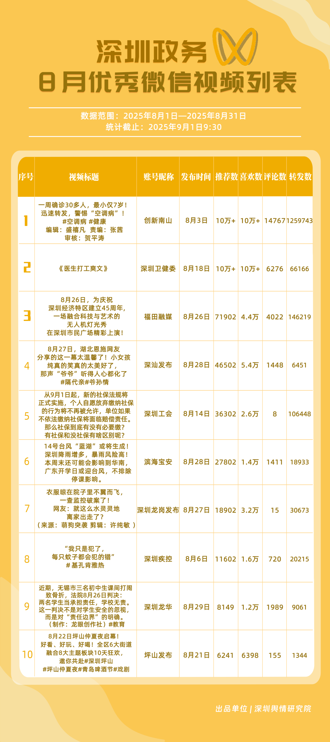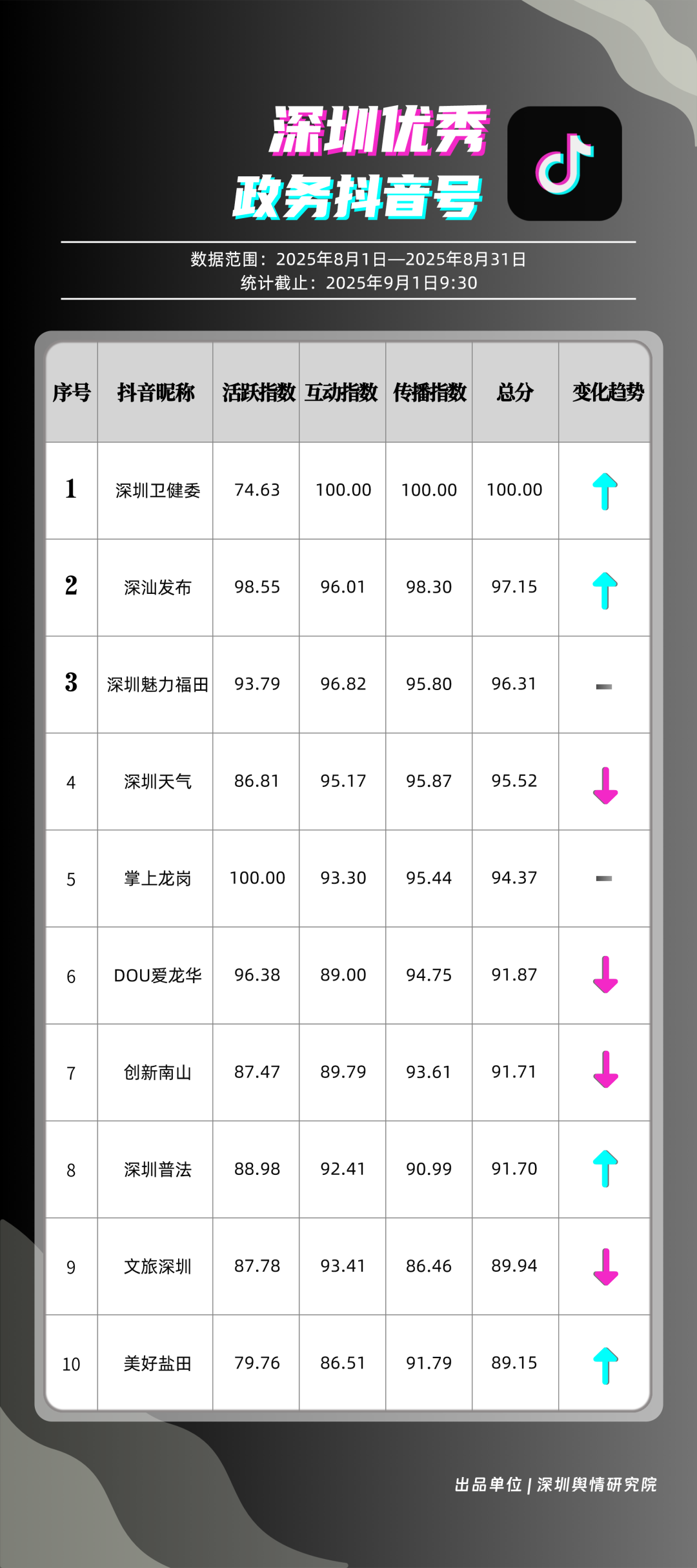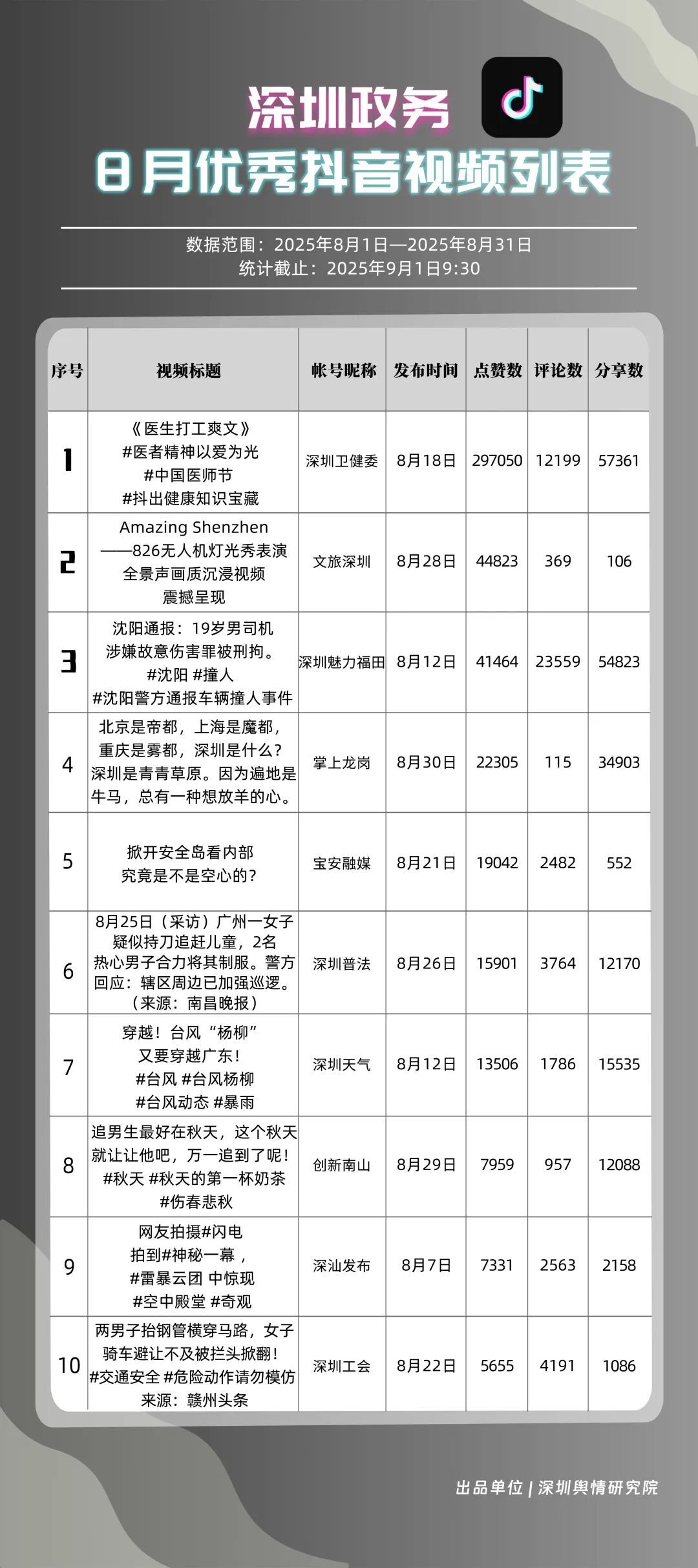 8月,“深圳衛(wèi)健委”“深汕發(fā)布”“深圳魅力福田”“深圳天氣”“掌上龍崗”“DOU愛龍華”“創(chuàng)新南山”“深圳普法”“文旅深圳”“美好鹽田”共10個(gè)政務(wù)抖音號(hào)獲得“優(yōu)秀政務(wù)抖音號(hào)”稱號(hào)?!吧钲谛l(wèi)健委”內(nèi)容吸引大量網(wǎng)民關(guān)注,4條視頻累計(jì)獲得超50萬次點(diǎn)贊,排名從上期的第九名上升至第一名;“深汕發(fā)布”憑借較高的傳播指數(shù)評(píng)分,位列第二名,排名有所上升?!吧钲邝攘ΩL铩薄吧钲谔鞖狻钡荣~號(hào)緊隨其后,得分均在95分左右。上榜的優(yōu)秀政務(wù)抖音號(hào)深耕優(yōu)質(zhì)創(chuàng)作,精準(zhǔn)把握網(wǎng)民興趣點(diǎn),使作品收獲高點(diǎn)贊、高轉(zhuǎn)發(fā),推動(dòng)評(píng)論區(qū)形成良性互動(dòng)氛圍,以優(yōu)秀內(nèi)容提升政務(wù)傳播效能。