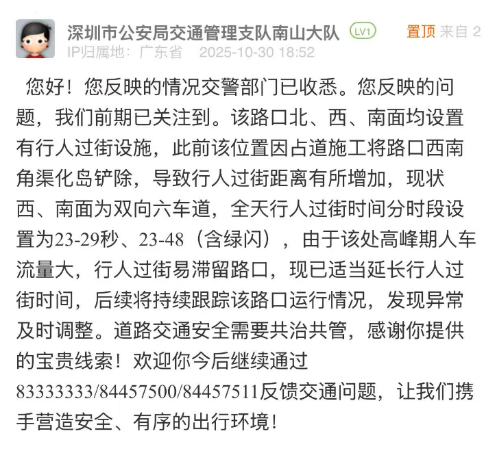 案例點評:南山交管部門在24小時內(nèi)對市民所反饋的問題進行答復,展現(xiàn)出精準、高效的治理態(tài)度,既說明過街時間短的原因,又根據(jù)該路口在高峰期人流大的實際情況,適當延長過街時間,體現(xiàn)出“因需調(diào)整、務實便民”的理念?;貞?,該部門還強調(diào)后續(xù)將持續(xù)跟蹤路口通行情況、及時優(yōu)化調(diào)整等,展示了精細化治理的決心和理念。